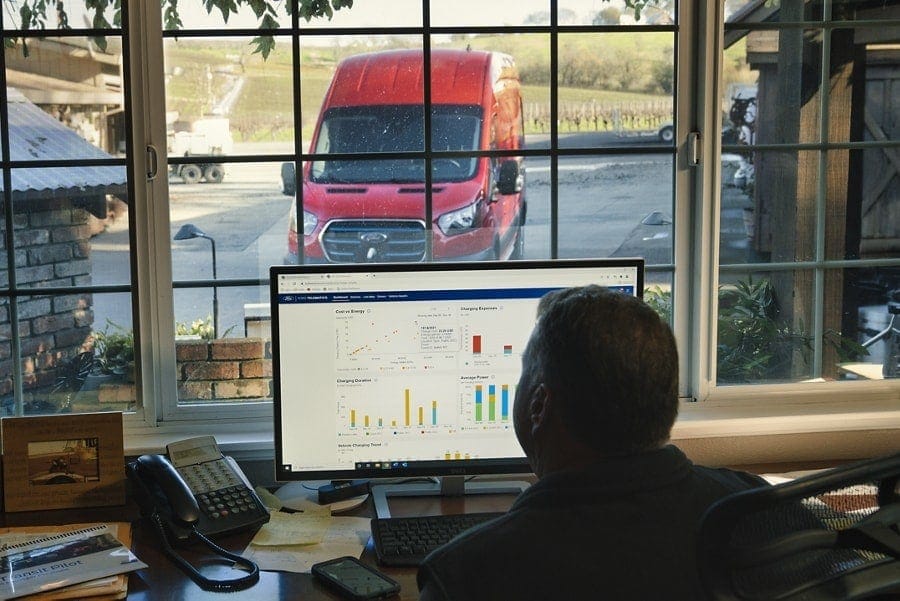 Manage all-electric vehicle charging with Ford Proâ„¢ E-Telematics. * E-Telematics is available at no extra charge for the first three years of electric vehicle ownership, monitors the charge status of your electric fleet, automatic software updates, usage reports and more.